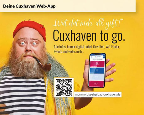Mit der Cuxhaven Web-App hat man „sein“ Cuxhaven immer auf dem Handy dabei. Sie zeigt auf einen Blick Wetter und Gezeiten, den aktuellen Veranstaltungskalender, die Busfahrpläne vom Bahnhof bis Duhnen und findet sogar das nächste WC. Allgemeine Ausflugsziele und aktuelle Events sind immer griffbereit dabei. Und das Schöne: Man muss nicht mal eine App herunterladen sondern einfach die nachfolgende Web-App auf dem Startbildschirm seines Handys verknüpfen.