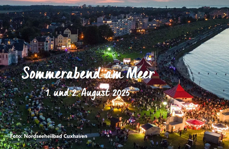 Das traditionelle Open-Air-Event am Weltschifffahrtsweg: Der Sommerabend am Meer in der Grimmershörnbucht wird auch 2025 wieder ein Erlebnis werden. Es erwarten dich wunderschöne Stunden mit einem bunten Mix aus Live-Musik auf zwei Bühnen, Kinderprogramm und vielen Leckereien direkt am Wasser mit einer grandiosen Pyro- und Lasershow. Ob mit Picknickdecke und Klappstuhl auf dem Deich oder tanzend direkt vor der Bühne - der Sommerabend am Meer ist das Highlight im Kalender der Cuxhavenerinnen, Cuxhavener und ihrer Gäste!